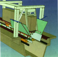 圖8中小車兩側加裝了可拆卸的擋板,開VI 寬從0.8米增加到1.4米,可將落料接住導人溝內;連 接方管旋轉45 度.可減少積 料:橫梁提高可 縮短立柱.筋板 加寬以增加強 度:立柱上的定 位塊增加了對 側板的縱向定 位功能(圖8中 的白色部分)。
