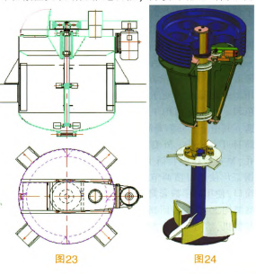 圖24是一個用于中心下料的主軸總成設計方案。因為軸承座工作環境比較惡劣。容易損壞軸承。本設計在皮帶輪下安裝了偏心環.推動柱塞泵將機油從軸承座下部吸入柱塞.并從上部軸承壓蓋注入軸承。達到對軸承進行強制潤滑的目的。也可以不用這么麻煩,直接安裝一個電動潤滑泵即可解決問題。中部葉輪為可選裝置,如果需要.就安裝在上下軸結合處的法蘭之間。主葉輪由三片漸開線渦輪葉片和三片弧形推進葉片組成,推進葉片焊接于底盤的開孔處.確保料漿經開孔向下推出.料漿流從簡底封頭返上時和渦輪式葉片打出去的料漿流交錯.激發強烈的湍流運動。推進式葉片的另一個作用是加快澆注下料速度。主葉輪直徑一般是筒體直徑的四分之一.或稍微大一點;轉速在每分鐘500轉到600轉之間;超過600轉因所需電機功率太大、效果卻不明顯,而不宜采用。另外,渦輪式葉輪不能使用導流筒。